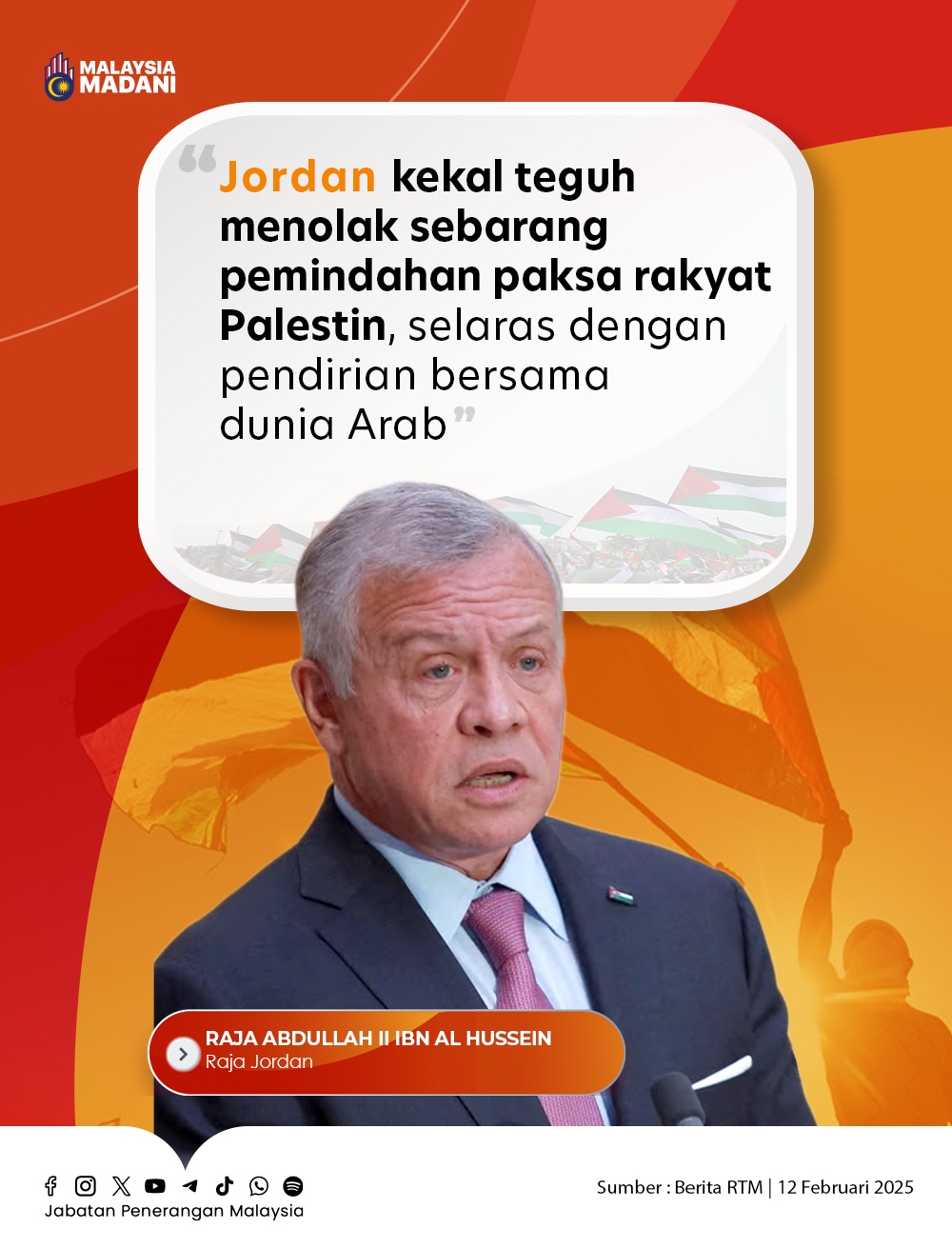 JORDAN KEKAL TEGUH MENOLAK SEBARANG PEMINDAHAN PAKSA RAKYAT PALESTIN, SELARAS DENGAN PENDIRIAN BERSAMA DUNIA ARAB