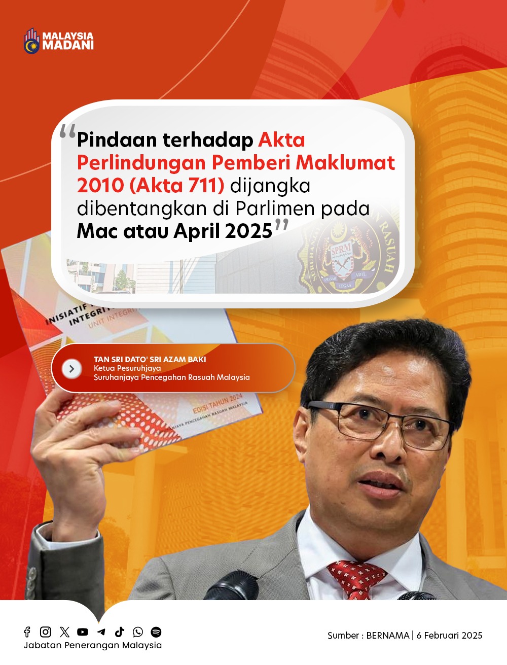 PINDAAN TERHADAP AKTA PERLINDUNGAN PEMBERI MAKLUMAT 2010 (AKTA 711) DIJANGKA DIBENTANGKAN DI PARLIMEN PADA MAC ATAU APRIL 2025