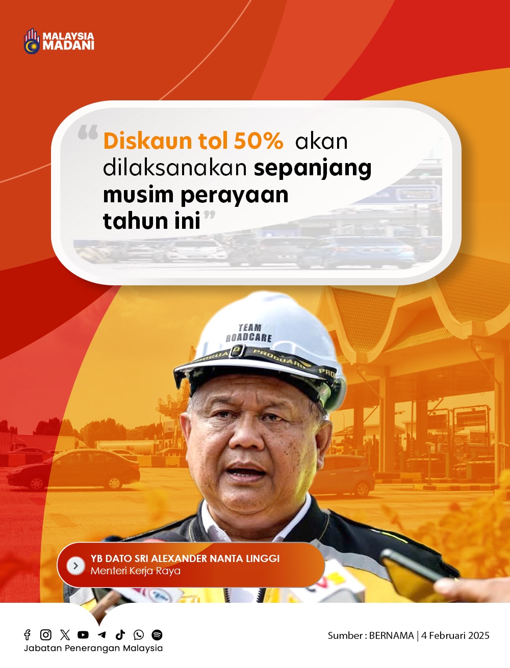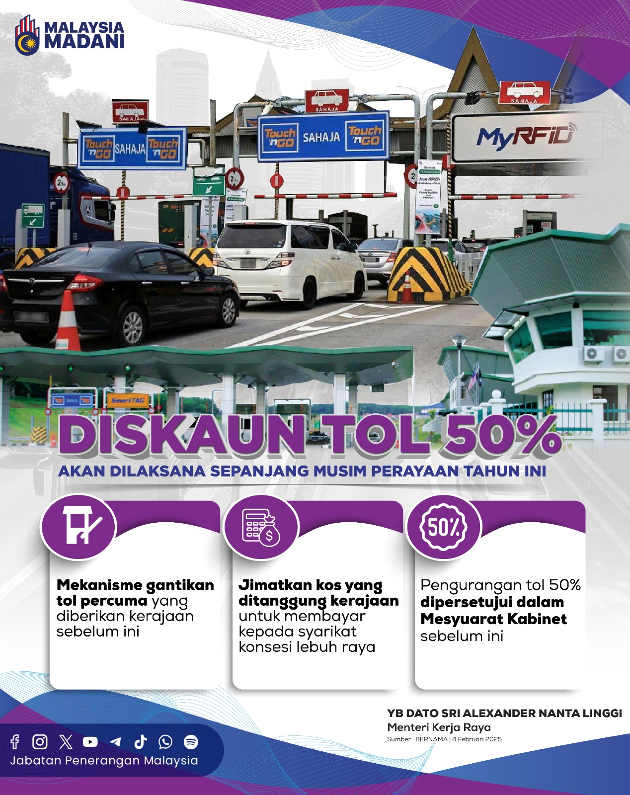 DISKAUN TOL 50% AKAN DILAKSANAKAN SEPANJANG MUSIM PERAYAAN TAHUN INI