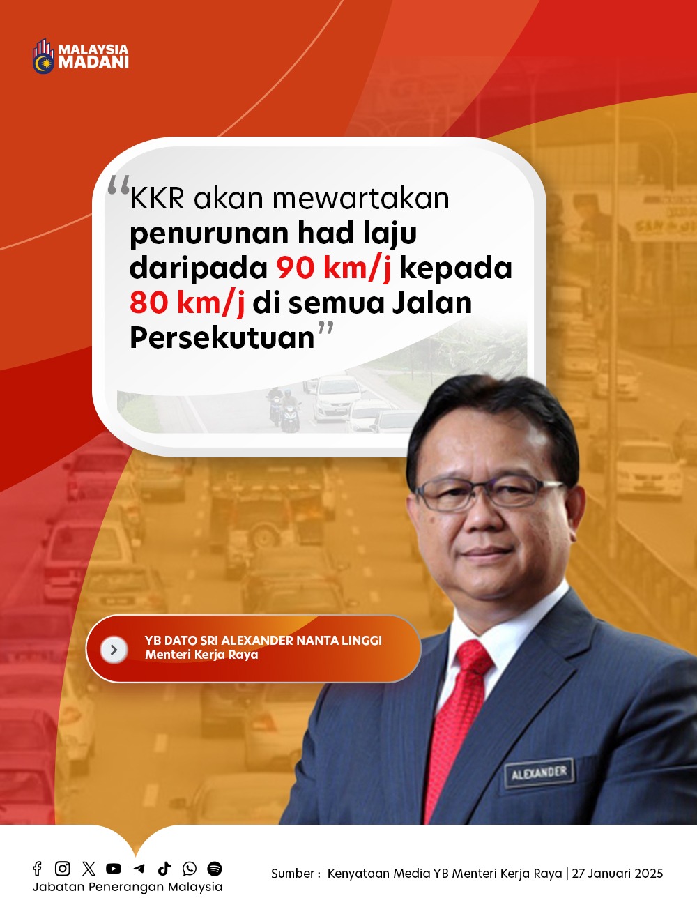 KKR AKAN MEWARTAKAN PENURUAN HAD LAJU DARIPADA 90 KM/J KEPADA 80 KM/J DI SEMUA JALAN PERSEKUTUAN