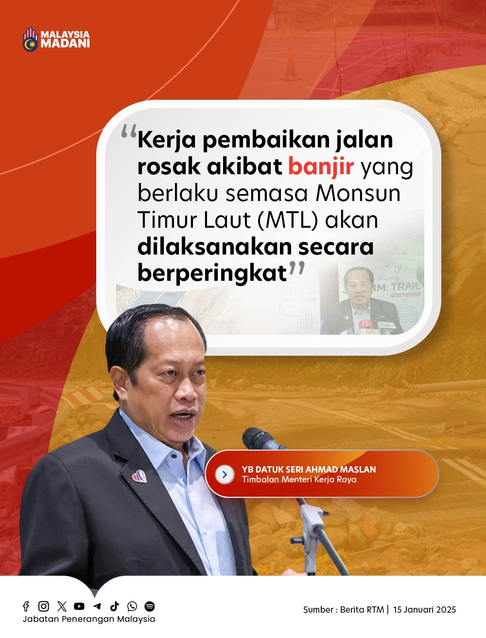 KERJA PEMBAIKAN JALAN ROSAK AKIBAT BANJIR YANG BERLAKU SEMASA MONSUN TIMUR LAUT (MTL) SECARA BERPERINGKAT