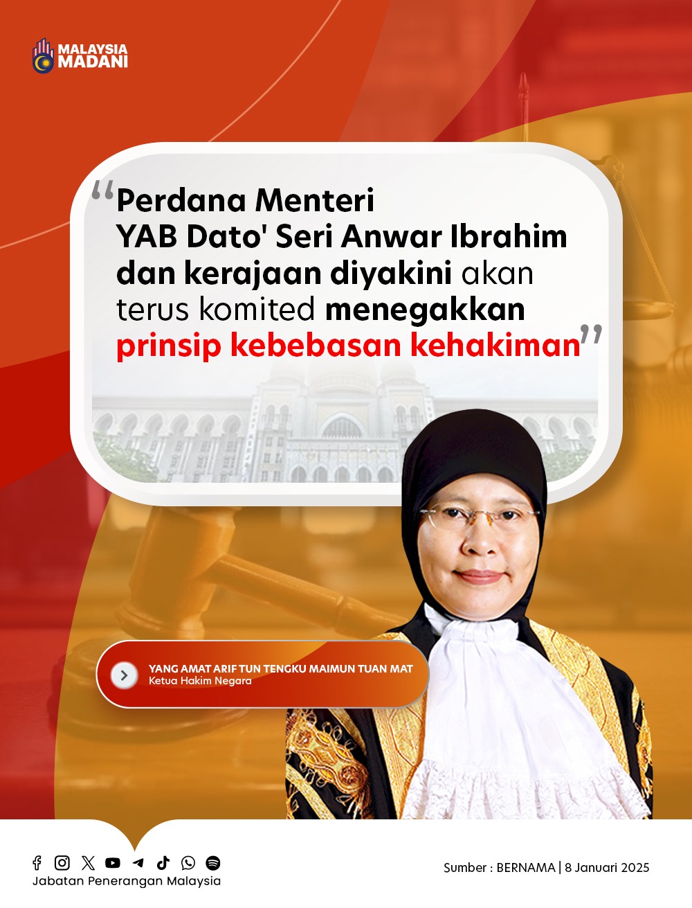 PERDANA MENTERI YAB DATO’ SERI ANWAR IBRAHIM DAN KERAJAAN DIYAKINI AKAN TERUS KOMITED MENEGAKKAN PRINSIP KEBEBASAN KEHAKIMAN