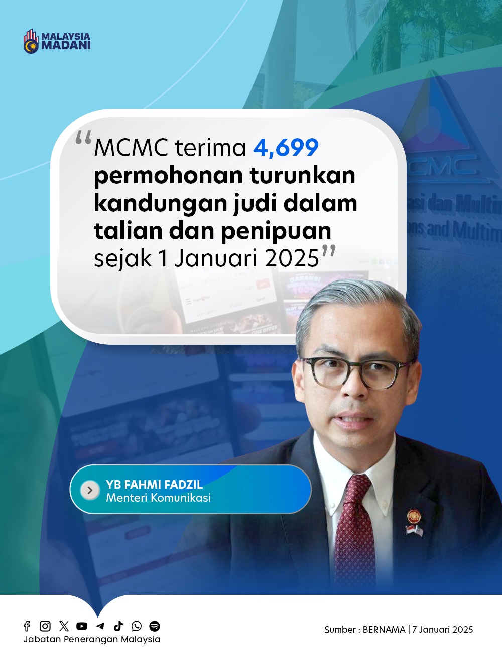 MCMC TERIMA 4,699 PERMOHONAN TURUNKAN KANDUNGAN JUDI DALAM TALIAN DAN PENIPUAN SEJAK 1 JANUARI 2025