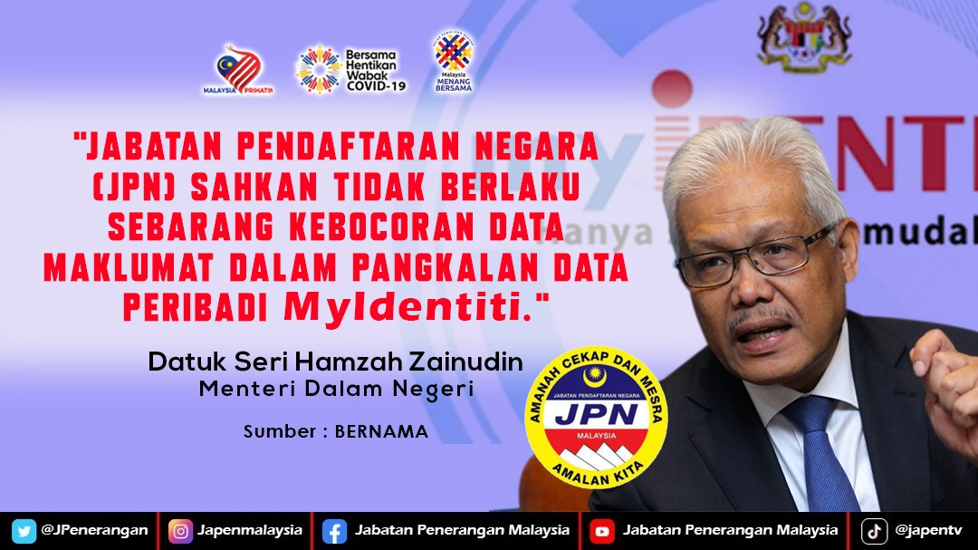 JABATAN PENDAFTARAN NEGARA (JPN) SAHKAN TIDAK BERLAKU SEBARANG KEBOCORAN DATA MAKLUMAT DALAM PANGKALAN DATA PERIBADI MYIDENTITI
