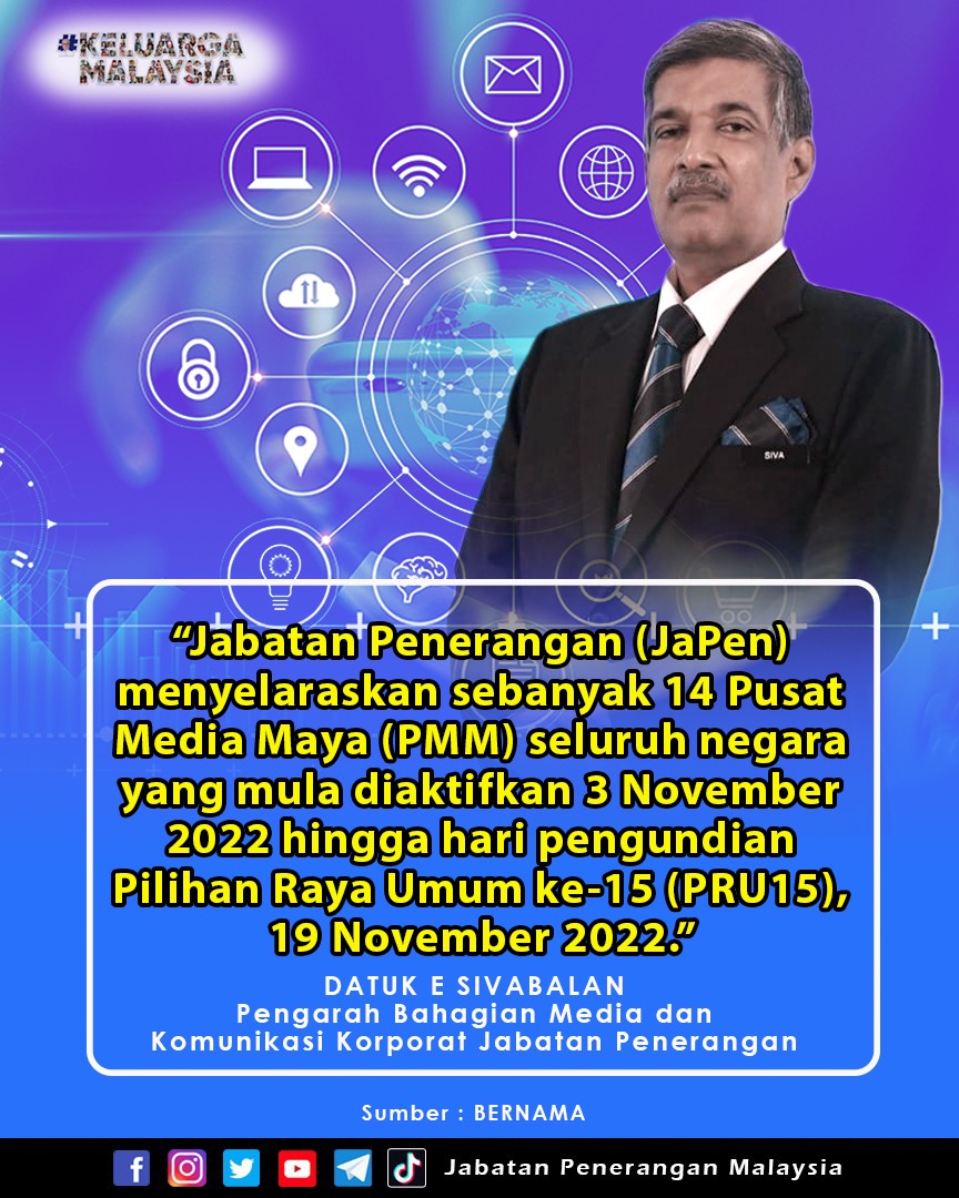 JABATAN PENERANGAN (JAPEN) MENYELARASKAN SEBANYAK 14 PUSAT MEDIA MAYA (PMM) SELURUH NEGARA YANG MULA DIAKTIFKAN 3 NOVEMBER 2022 HINGGA HARI PENGUNDIAN PILIHAN RAYA UMUM KE-15 (PRU15) 19 NOVEMBER 2022