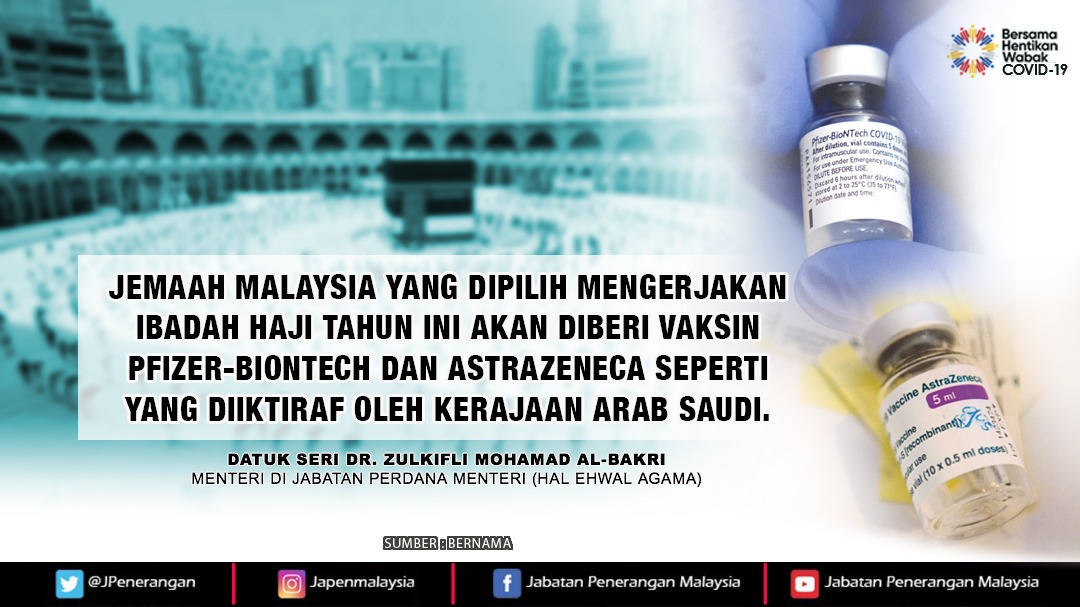 JEMAAH MALAYSIA YANG DIPILIH MENGERJAKAN IBADAH HAJI TAHUN INIAKAN DIBERI VAKSIN PFIZER-BIONTECH DAN ASTRAZENECA SEPERTI YANG DIIKTIRAF OLEH KERAJAAN ARAB SAUDI