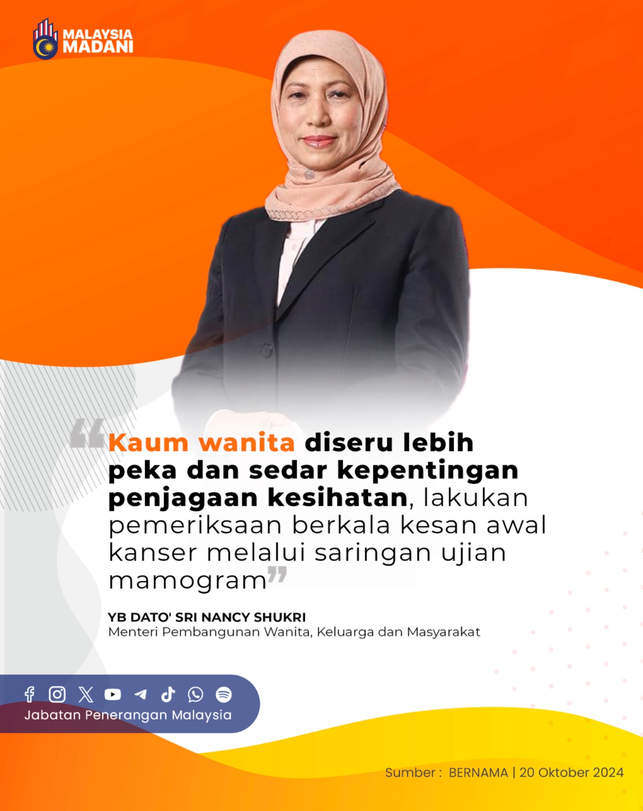 KAUM WANITA DISERU LEBIH PEKA DAN SEDAR KEPENTINGAN PENJAGAAN KESIHATAN, LAKUKAN PEMERIKSAAN BERKALA KESAN AWAL KANSER MELALUI SARINGAN UJIAN MAMOGRAM