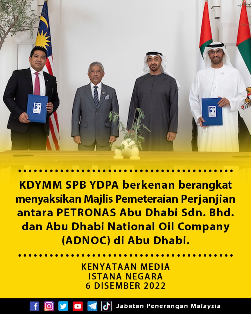 KDYMM SPBA BERKENAN BERANGKAT MENYAKSIKAN MAJLIS PEMETERAIAN PERJANJIAN ANTARA PETRONAS ABU DHABI SDN. BHD. DAN ABU DHABI NATIONAL OIL COMPANY (ADNOC) DI ABU DHABI