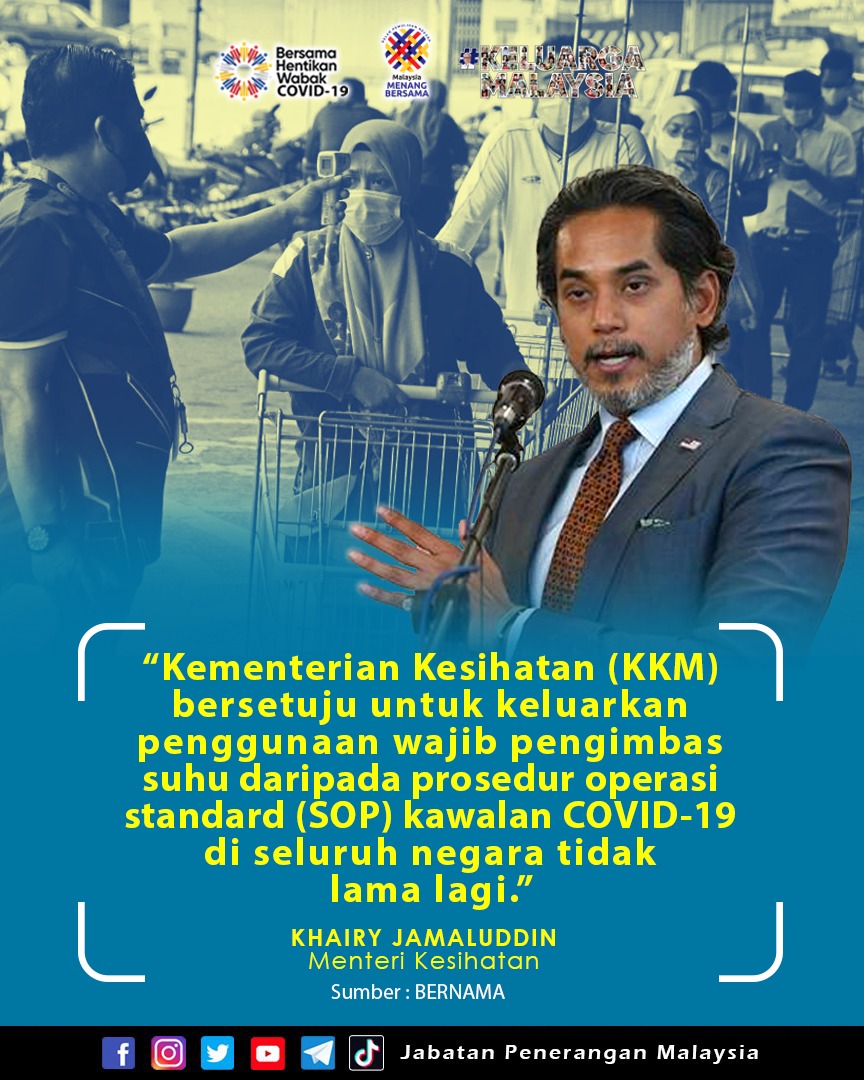 KEMENTERIAN KESIHATAN KKM BERSETUJU UNTUK KELUARKAN PENGGUNAAN WAJIB PENGIMBAS SUHU DARIPADA PROSEDUR OPERASI STANDARD (SOP) KAWALAN COVID-19 DISELURUH NEGARA TIDAK LAMA LAGI