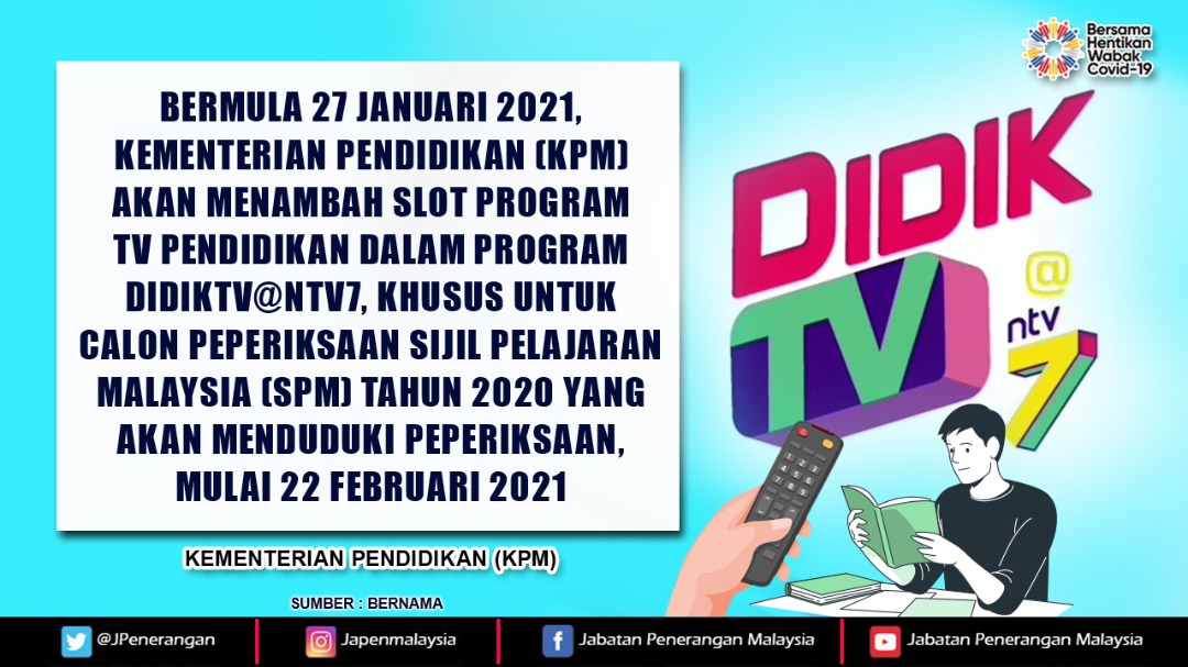 KEMENTERIAN PENDIDIKAN (KPM) MENAMBAH SLOT PROGRAM TV PENDIDIKAN DALAM PROGRAM DIDIKTV@NTV7, KHUSUS UNTUK CALON PEPERIKSAAN SPM TAHUN 2020 YANG AKAN MENDUDUKI PEPERIKSAAN, MULAI 22 FEBRUARI INI.