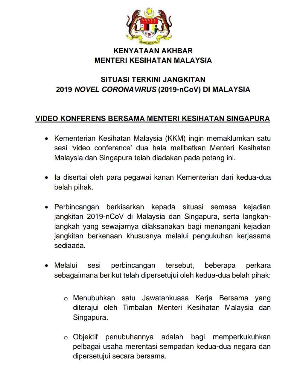 Situasi Terkini Jangkitan 2019 Novel Coronabirus (2019-nCoV) Di Malaysia. Video Konferens bersama Menteri Kesihatan Singapura.