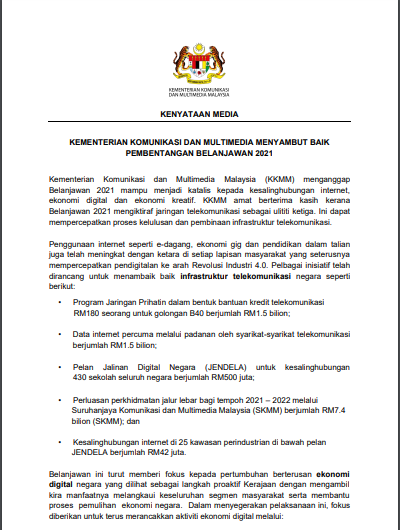 KENYATAAN MEDIA: KEMENTERIAN KOMUNIKASI DAN MULTIMEDIA MENYAMBUT BAIK PEMBENTANGAN BELANJAWAN 2021