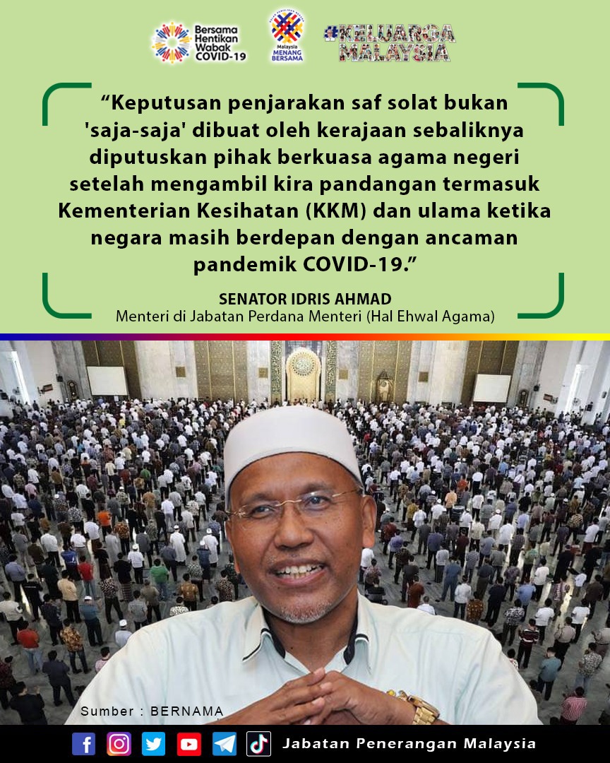 KEPUTUSAN PENJARAKAN SAF SOLAT BUKAN ‘SAJA-SAJA’ DIBUAT OLEH KERAJAAN SEBALIKNYA DIPUTUSKAN PIHAK BERKUASA AGAMA NEGERI SETELAH MENGAMBIL KIRA PANDANGAN TERMASUK KEMENTERIAN KESIHATAN MALAYSIA (KKM) DAN ULAMA KETIKA NEGARA MASIH BERDEPAN DENGAN ANCAMAN PANDEMIK COVID-19
