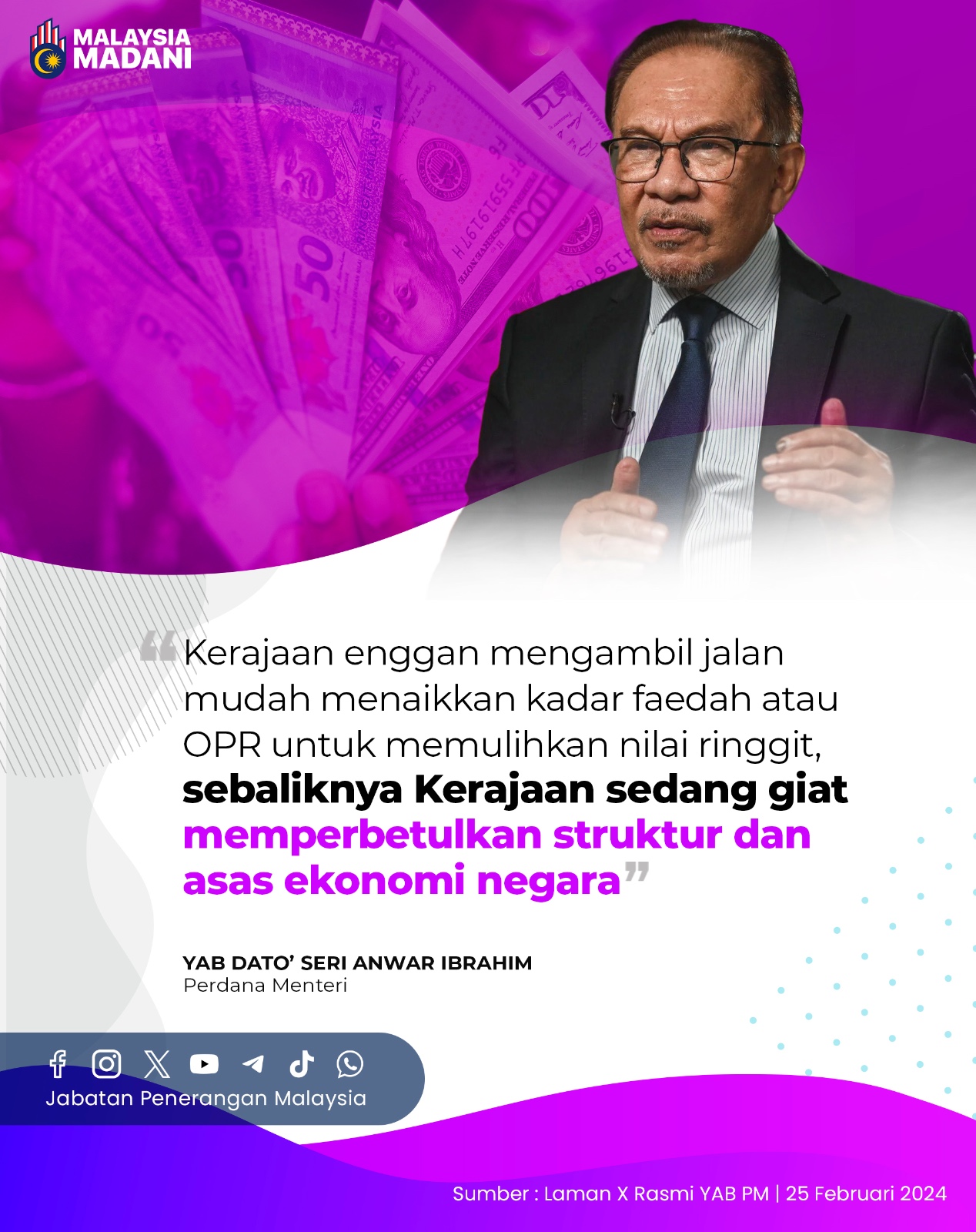KERAJAAN ENGGAN MENGAMBIL JALAN MUDAH MENAIKKAN KADAR FAEDAH ATAU OPR UNTUK MEMULIHKAN NILAI RINGGIT, SEBALIKNYA KERAJAAN SEDANG GIAT MEMPERBETULKAN STRUKTUR DAN ASAS EKONOMI NEGARA