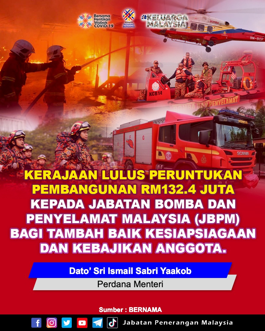 KERAJAAN LULUS PERUNTUKKAN PEMBANGUNAN RM132.4 JUTA KEPADA JABATAN BOMBA DAN PENYELAMAT MALAYSIA (JBPM) BAGI TAMBAH BAIK KESIAPSIAGAAN DAN KEBAJIKAN ANGGOTA