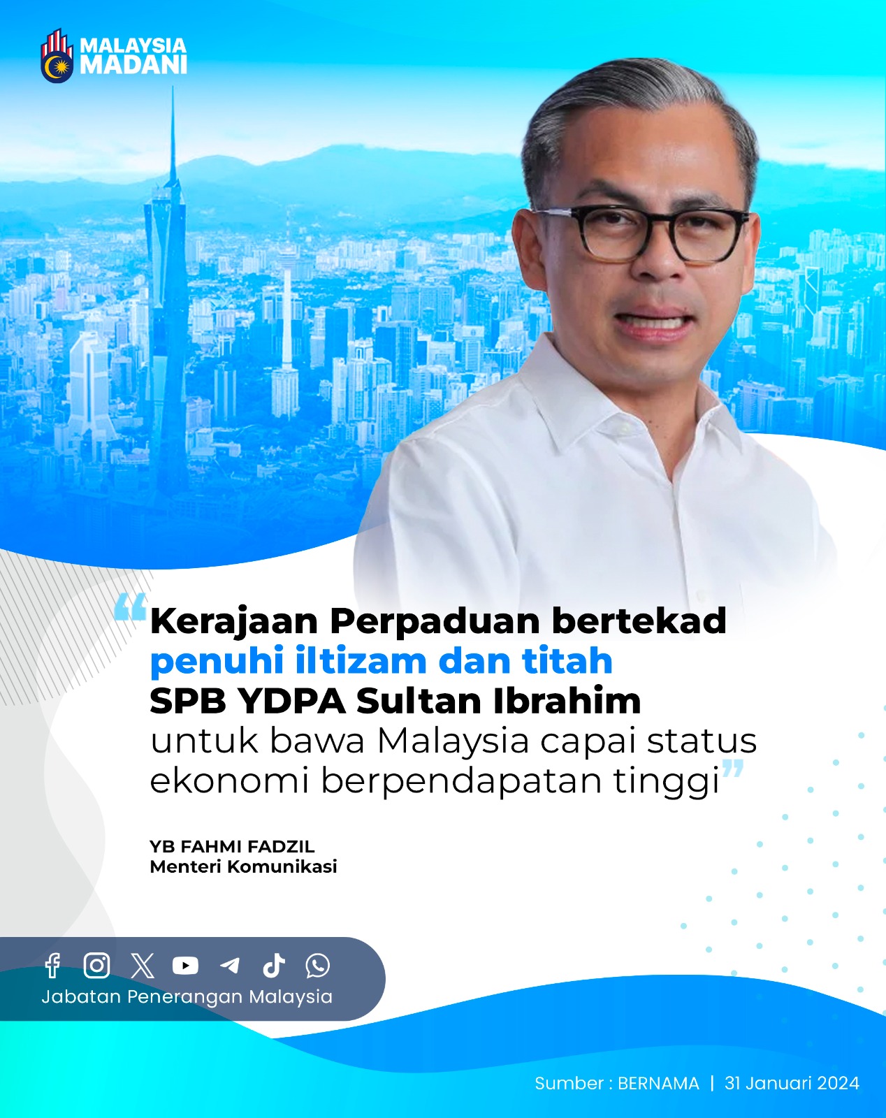 KERAJAAN PERPADUAN BERTEKAD PENUHI ILTIZAM DAN TIDAH SPB YDPA SULATAN IBRAHIM UNTUK BAWA MALAYSIA CAPAI STATUS EKONOMI BERPENDAPATAN TINGGI