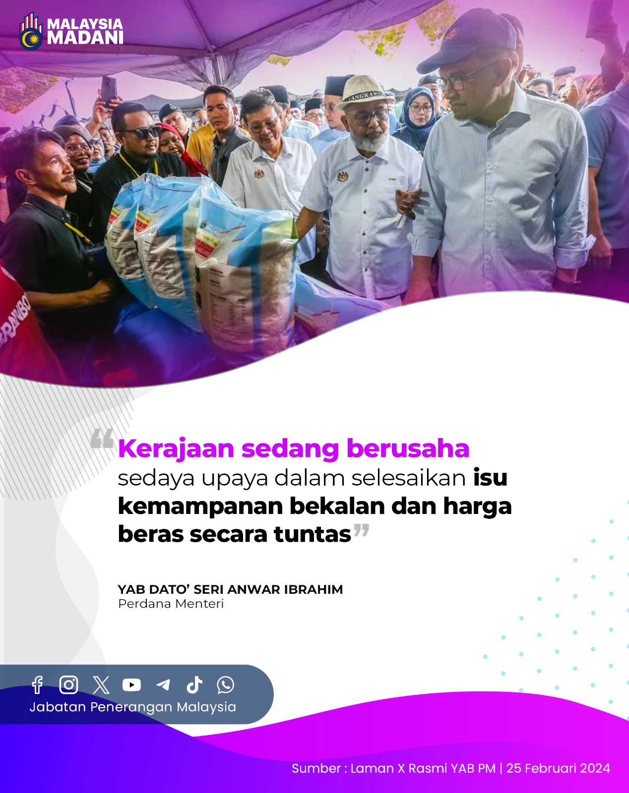 KERAJAAN SEDANG BERUSAHA SEDAYA UPAYA DALAM SELESAIKAN ISU KEMAMPUAN BEKALAN DAN HARGA BERAS SECARA TUNTAS