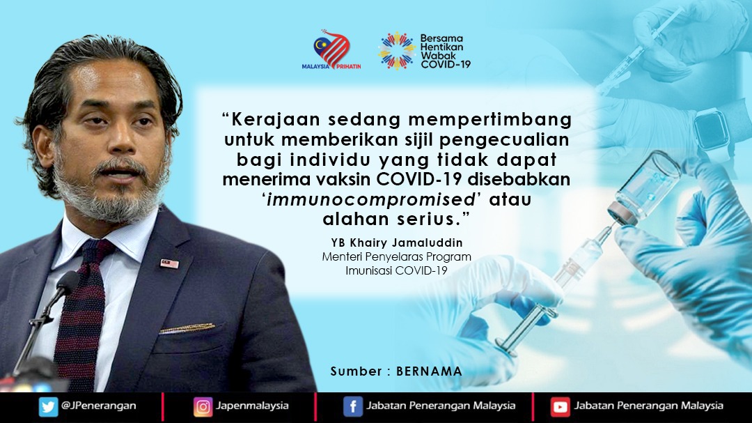 KERAJAAN SEDANG MEMPERTIMBANGKAN UNTUK MEMBERIKAN SIJIL PENGECUALIAN BAGI INDIVIDU YANG TIDAK DAPAT MENERIMA VAKSIN COVID 19 DISEBABKAN IMMUNOCOMPROMISED ATAU ALAHAN SERIUS