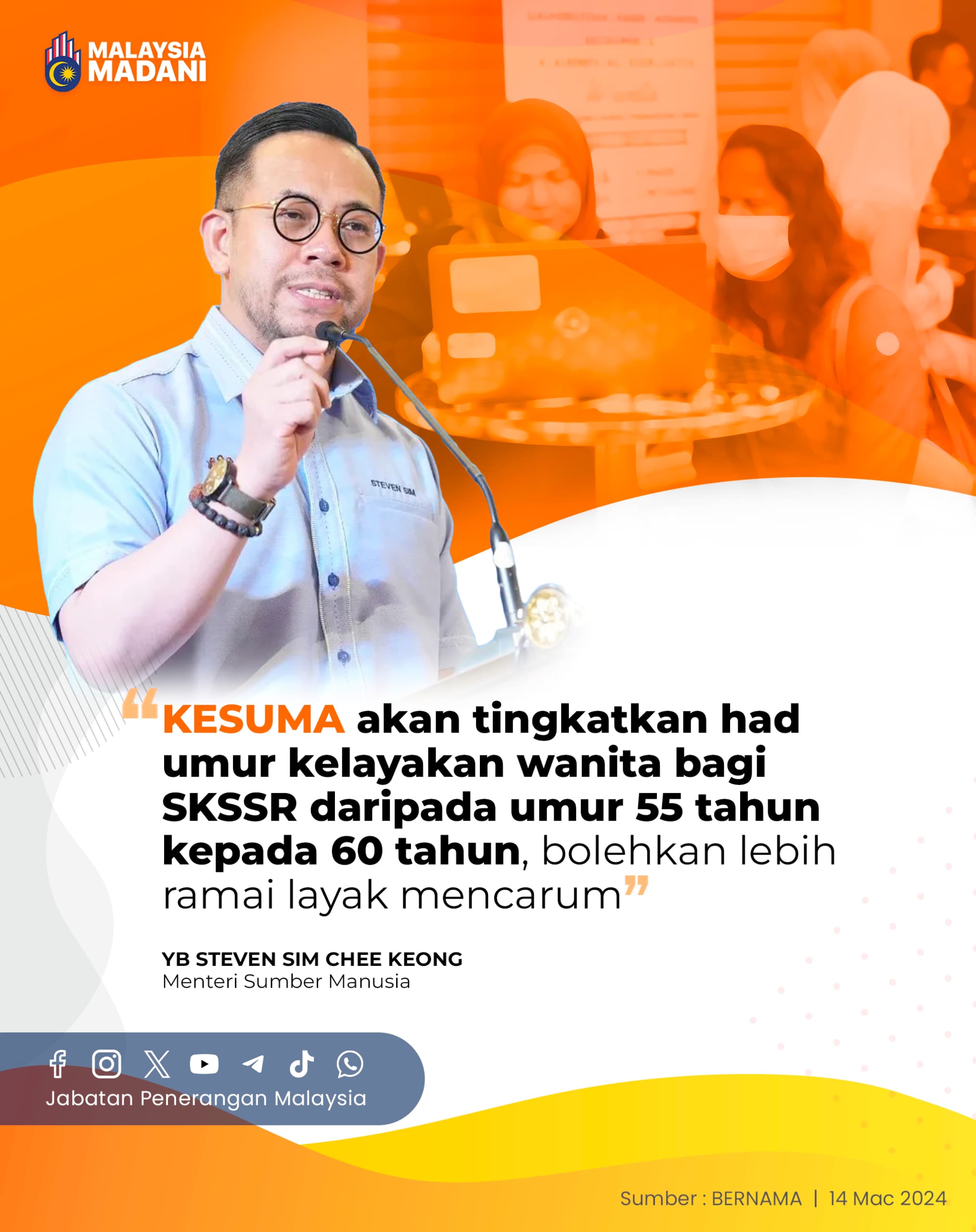 KESUMA AKAN TINGKATKAN HAD UMUR KELAYAKAN WANITA BAGI SKSSR DARIPADA UMUR 55 TAHUN KEPADA 60 TAHUN, BOLEKAN LEBIH RAMAI LAYAK MENCARUM