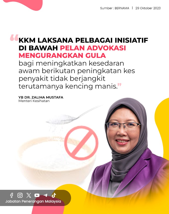KKM LAKSANA PELBAGAI INISIATIF DI BAWAH PELAN ADVOKASI MENGURANGKAN GULA BAGI MENINGKATKAN KESEDARAN AWAM BERIKUTAN PENINGKATAN KES PENYAKIT TIDAK BERJANGKIT TERUTAMANYA KENCING MANIS