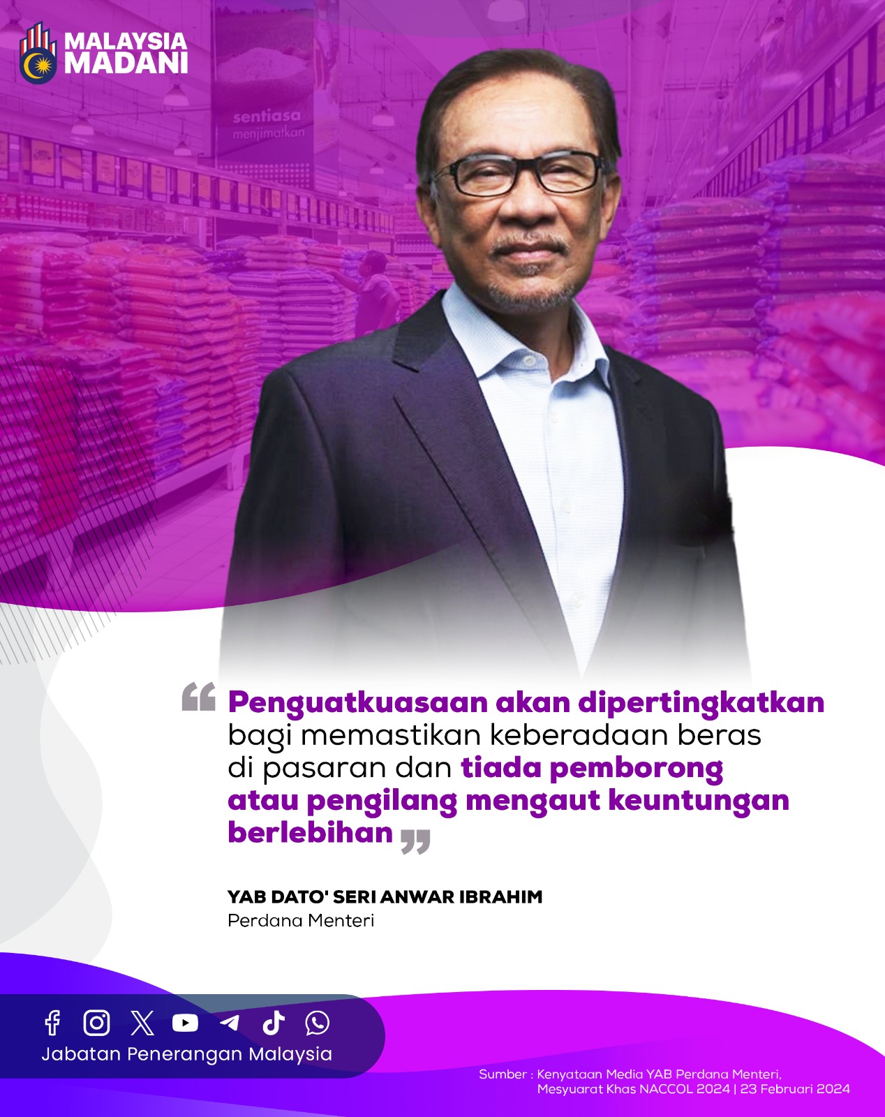 PENGUATKUASAAN AKAN DIPERTINGKATKAN BAGI MEMASTIKAN KEBERADAAN BERAS DI PASARAN DAN TIADA PEMBORONG ATAU PENGILANG MENGAUT KEUNTUNGAN BERLEBIHAN
