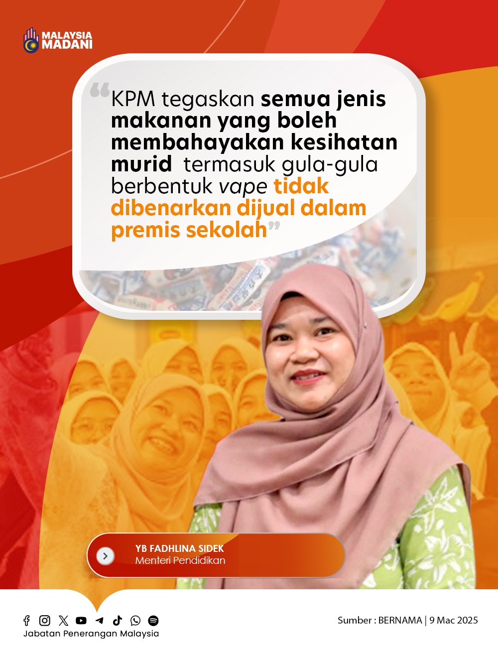 KPM TEGASKAN SEMUA JENIS MAKANAN YANG BOLEH MEMBAHAYAKAN KESIHATAN MURID TERMASUK GULA-GULA-BERBENTUK VAPE TIDAK DIBENARKAN DIJUAL DALAM PREMIS SEKOLAH