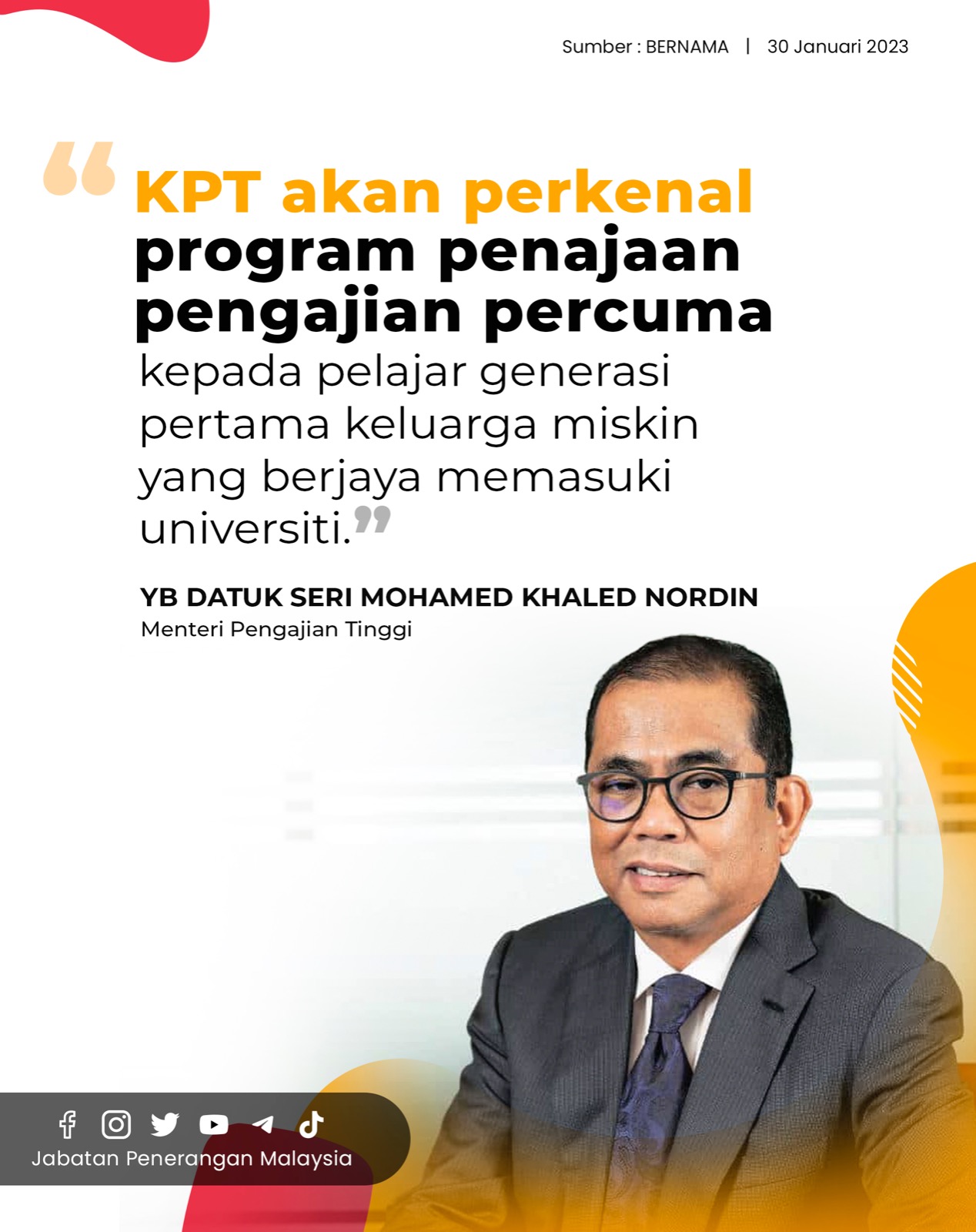 KPT AKAN PERKENAL PROGRAM PENAJAAN PENGAJIAN PERCUMA KEPADA PELAJAR GENERASI PERTAMA KELUARGA MISKIN YANG BERJAYA MEMASUKI UNIVERSITI