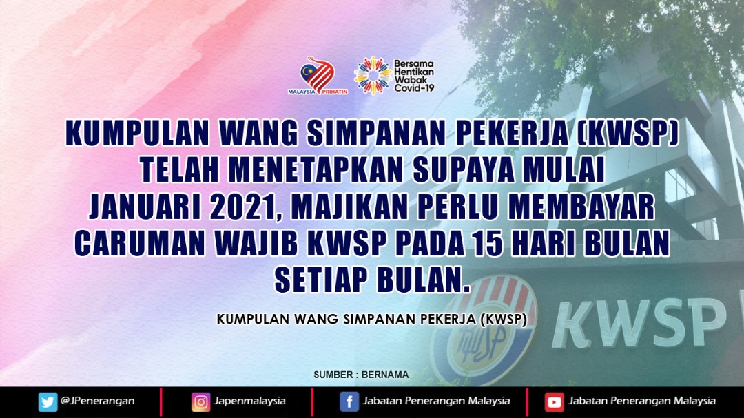 KUMPULAN WANG SIMPANAN PEKERJA (KWSP) TELAH MENETAPKAN SUPAYA MULAI JANUARI 2021, MAJIKAN PERLU MEMBAYAR CARUMAN WAJIB KWSP PADA 15 HARI BULAN SETIAP BULAN