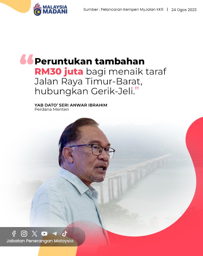 PERUNTUKAN TAMBAHAN RM30 JUTA BAGI MENAIK TARAF JALAN RAYA TIMUR BARAT HUBUNGKAN GERIK JELI
