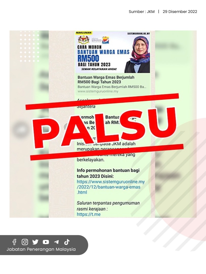 MAKLUMAN BAHAWA INFORMASI YANG TULAR DI LAMA SOSIAL BERHUBUNG DENGAN ‘BANTUAN WARGA EMAS RM500 BAGI TAHUN 2023’ ADALAH PALSU!
