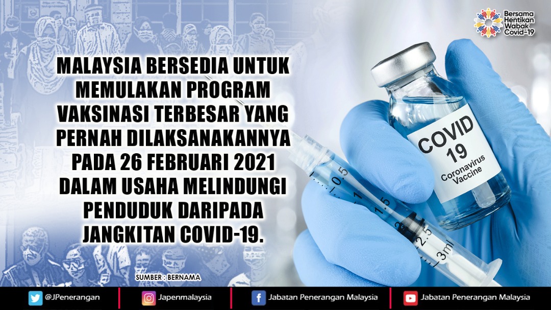 MALAYSIA BERSEDIA UNTUK MEMULAKAN PROGRAM VAKSINASI TERBESAR YANG PERNAH DILAKSANAKANNYA PADA 26 FEBRUARI 2021 DALAM USAHA MELINDUNG PENDUDUK DARIPADA JANGKITAN COVID 19
