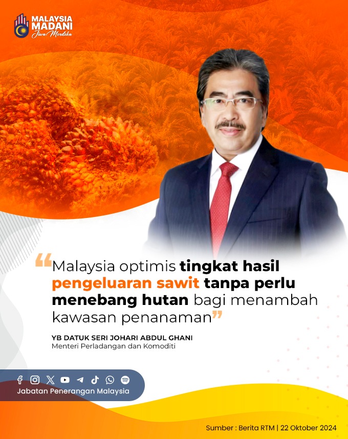 MALAYSIA OPTIMIS TINGKAT HASIL PENGELUARAN SAWIT TANPA PERLU MENEBANG HUTAN BAGI MENAMBAH KAWASAN PENANAMAN