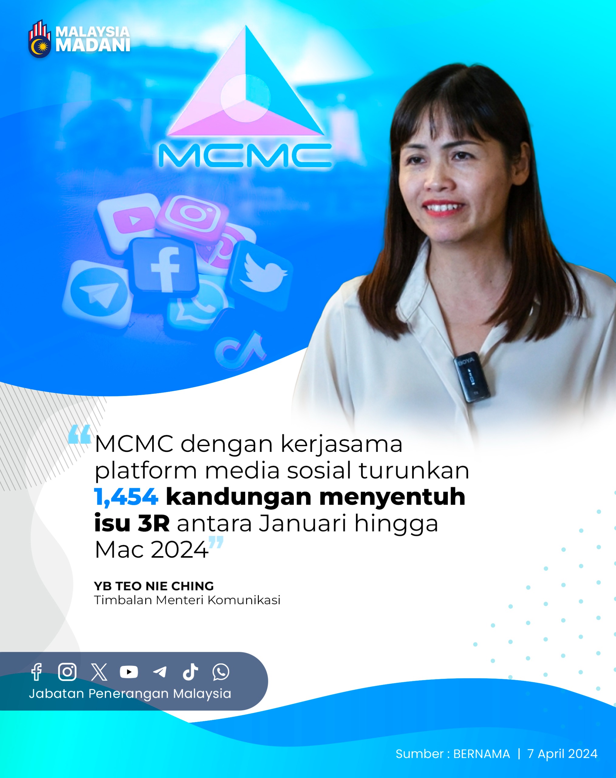 MCMC DENGAN KERJASAMA PLATFORM MEDIA SOSIAL TURUNKAN 1,454 KANDUNGAN MENYENTUH ISU 3R ANTARA JANUARI HINGGA MAC 2024