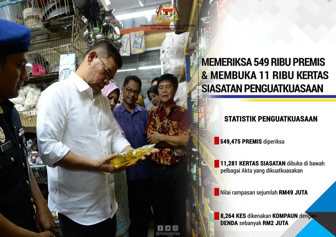 Sebanyak 549,475 premis telah diperiksa dan daripadanya sebanyak 11,281 kertas siasatan dibuka di bawah pelbagai akta yang dikuatkuasakan dengan nilai rampasan dianggarkan berjumlah RM49.04 juta.