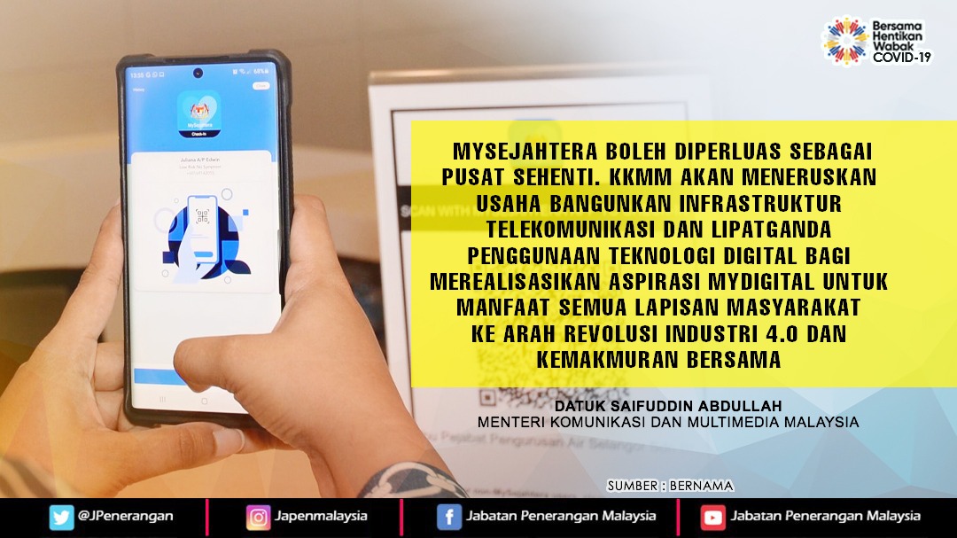 MYSEJAHTERA BOLEH DIPERLUAS SEBAGAI PUSAT SEHENTI. KKMM AKAN MENERUSKAN USAHA BANGUNKAN INFRASTRUKTUR TELEKOMUNIKASI DAN LIPATGANDA PENGGUNAAN TEKNOLOGI DIGITAL BAGI MEREALISASIKAN ASPIRASI MYDIGITAL UNTUK MANFAAT SEMUA LAPISAN MASYARAKAT KE ARAH REVOLUSI INDUSTRI 4.0 DAN KEMAKMURAN BERSAMA