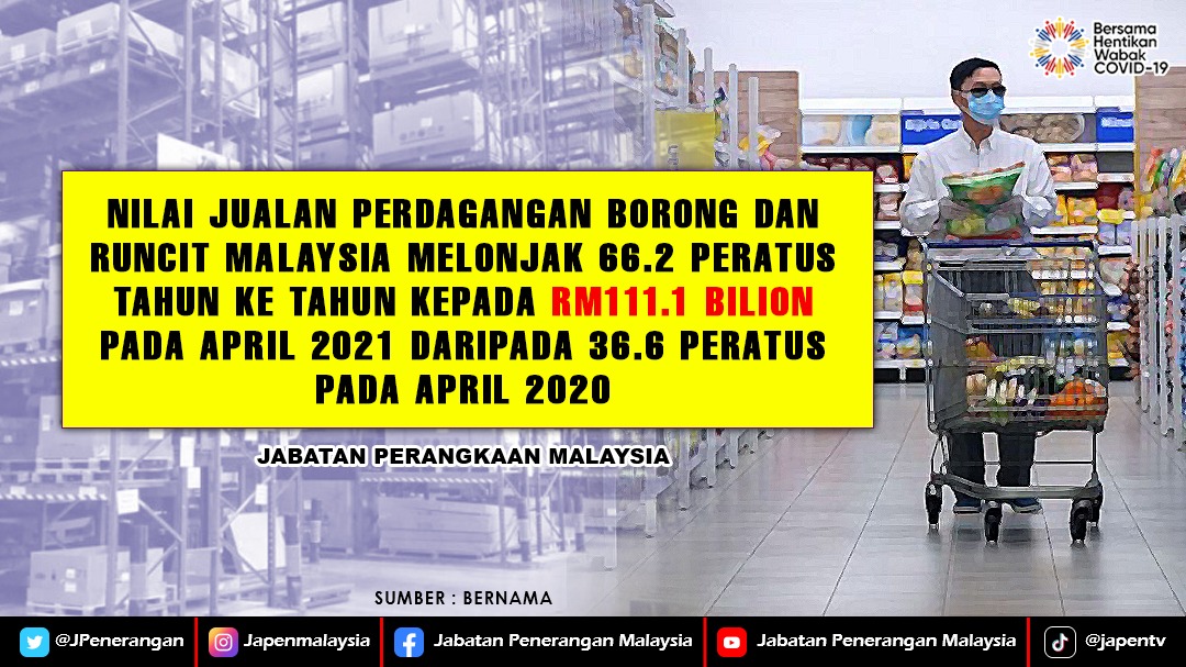 NILAI JUALAN PERDAGANGAN BORONG DAN RUNCIT MALAYSIA MELONJAK 66.2 PERATUS TAHUN KE TAHUN KEPADA RM111.1 BILION PADA APRIL 2021 DARIPADA 36.6 PERATUS PADA APRIL 2020