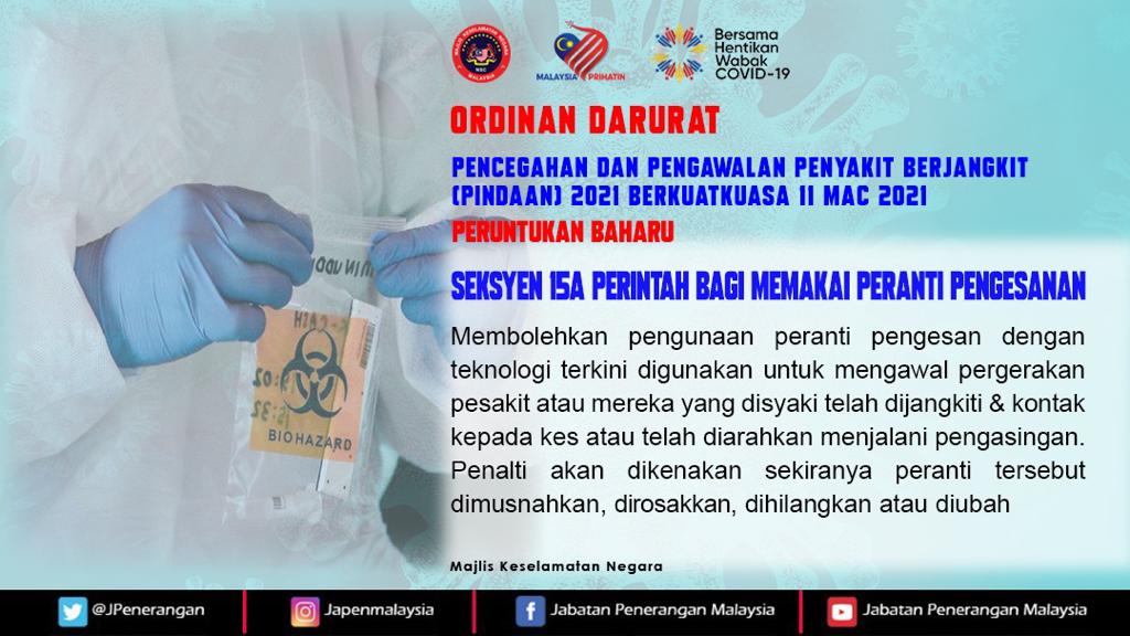 ORDINAN DARURAT – PENCEGAHAN DAN PENGAWALAN PENYAKIT BERJANGKIT (PINDAAN) 2021 BERKUATKUASA 11 MAC 2021 – SEKSYEN 15A PERINTAH BAGI MEMAKAI PERANTI PENGESANAN