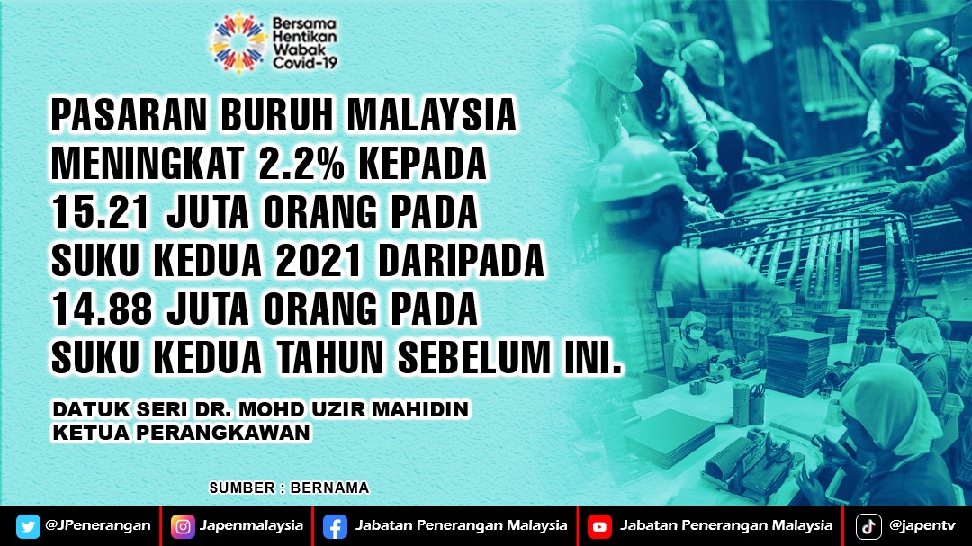 PASARAN BURUH MALAYSIA MENINGKAT 2.2% KEPADA 15.21 JUTA ORANG PADA SUKU KEDUA 2021 DARIPADA 14.88 JUTA ORANG PADA SUKU KEDUA TAHUN SEBELUM INI