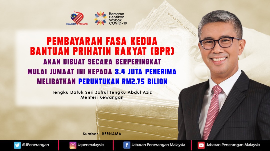 PEMBAYARAN FASA KEDUA BANTUAN PRIHATIN RAKYAT (BPR) AKAN DIBUAT SECARA BERPERINGKAT MULAI JUMAAT INI KEPADA 8.4 JUTA PENERIMA MELIBATKAN PERUNTUKAN RM2.75 BILION