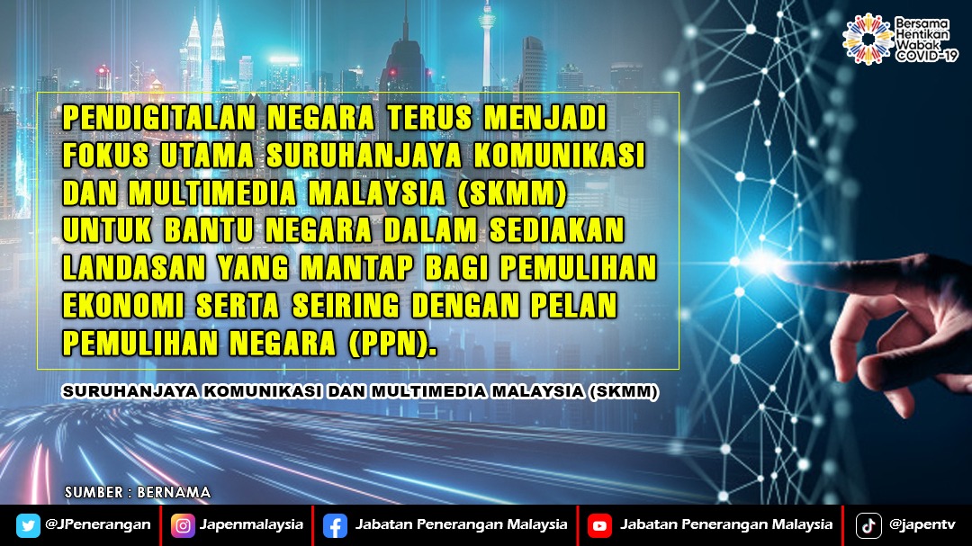 PENDIGITALAN NEGARA TERUS MENJADI FOKUS UTAMA SURHANJAYA KOMUNIKASI DAN MULTIMEDIA MALAYSIA SKMM UNTUK BANTU NEGARA DALAM SEDIAKAN LANDASAN YANG MANTAP BAGI PEMULIHAN EKONOMI SERTA SEIRING DENGAN PELAN PEMULIHAN NEGARA