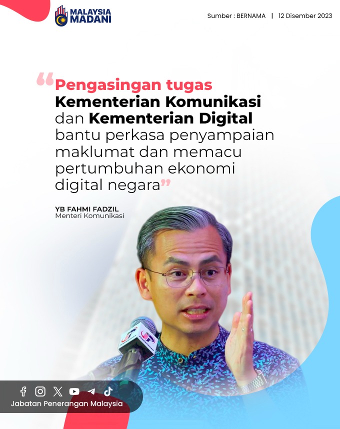 PENGASINGAN TUGAS KEMENTERIAN KOMUNIKASI DAN KEMENTERIAN DIGITAL BANTU PERKASA PENYAMPAIAN MAKLUMAT DAN MEMACU PERTUMBUHAN EKONOMI DIGITAL NEGARA
