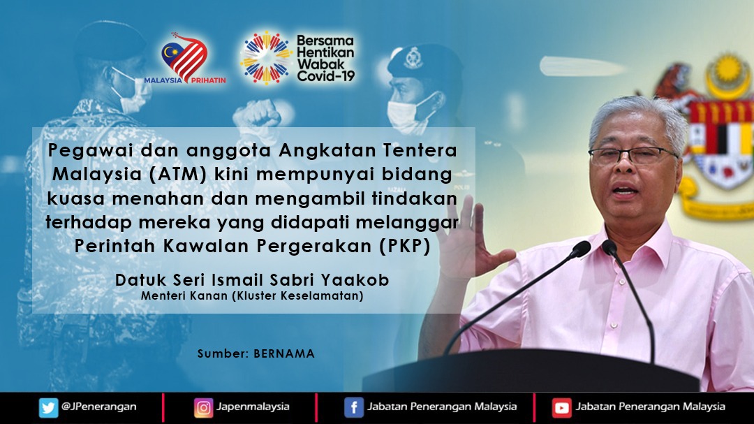 PENGAWAI DAN ANGGOTA ANGKATAN TENTERA MALAYSIA (ATM) KINI MEMPUNYAI BIDANG KUASA MENAHAN DAN MENGAMBIL TINDAKAN TERHADAP MEREKA YANG DIDAPATI MELANGGAR PERINTAH KAWALAN PERGERAKAN (PKP)