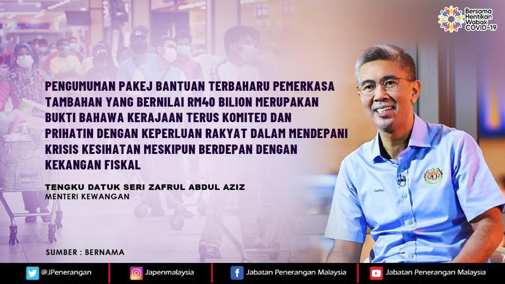 PENGUMUMAN PAKEJ BANTUAN TERBAHARU PEMERKASA TAMBAHAN YANG BERNILAI RM40 BILION MERUPAKAN BUKTI BAHAWA KERAJAAN TERUS KOMITED DAN PRIHATIN DENGAN KEPERLUAN RAKYAT DALAM MENDEPANI KRISIS KESIHATAN MESKIPUN BERDEPAN DENGAN KEKANGAN FISKAL
