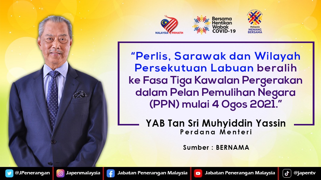 PERLIS, SARAWAK DAN WILAYAH PERSEKUTUAN LABUAN BERALIH KE FASA TIGA KAWALAN PERGERAKAN DALAM PELAN PEMULIHAN NEGARA (PPN) MULAI 4 0GOS 2021