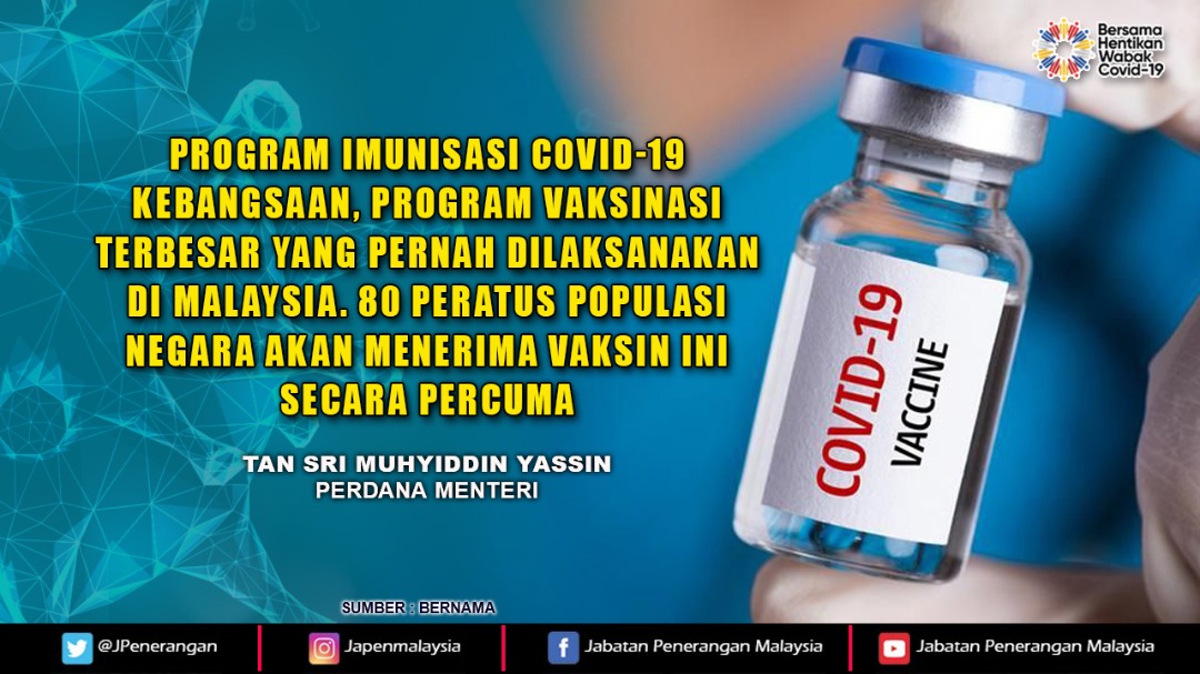 PROGRAM IMUNISASI COVID-19 KEBANGSAAN, PROGRAM VAKSINASI TERBESAR YANG PERNAH DILAKSANAKAN DI MALAYSIA. 80 PERATUS POPULASI NEGARA AKAN MENERIMA VAKSIN INI SECARA PERCUMA