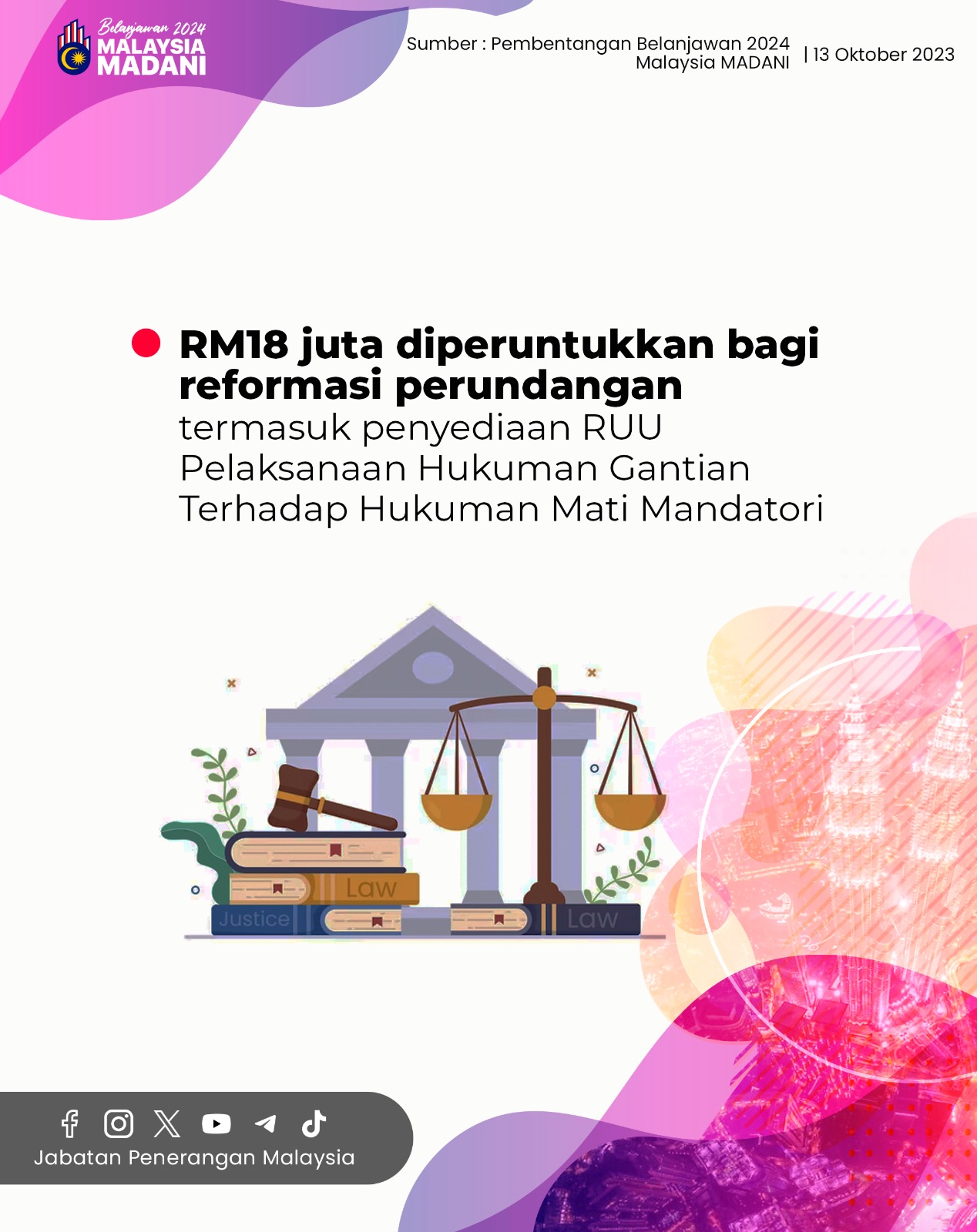 RM18 JUTA DIPERUNTUKKAN BAGI REFORMASI PERUNDANGAN TERMASUK PENYEDIAAN RUU PELAKSANAAN HUKUMAN GANTIAN TERHADAP HUKUMAN GANTIAN TERHADAP HUKUMAN MATI MANDATORI