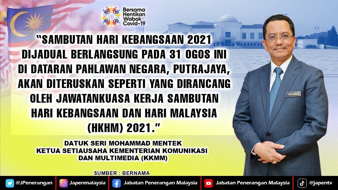 SAMBUTAN HARI KEBANGSAAN 2021 DIJADUAL BERLANGSUNG PADA 31 OGOS INI DI DATARAN PAHLAWAN NEGARA, PUTRAJAYA, AKAN DITERUSKAN SEPERTI YANG DIRANCANG OLEH JAWATANKUASA KERJA SAMBUTAN HARI KEBANGSAAN DAN HARI MALAYSIA (HKHM) 2021