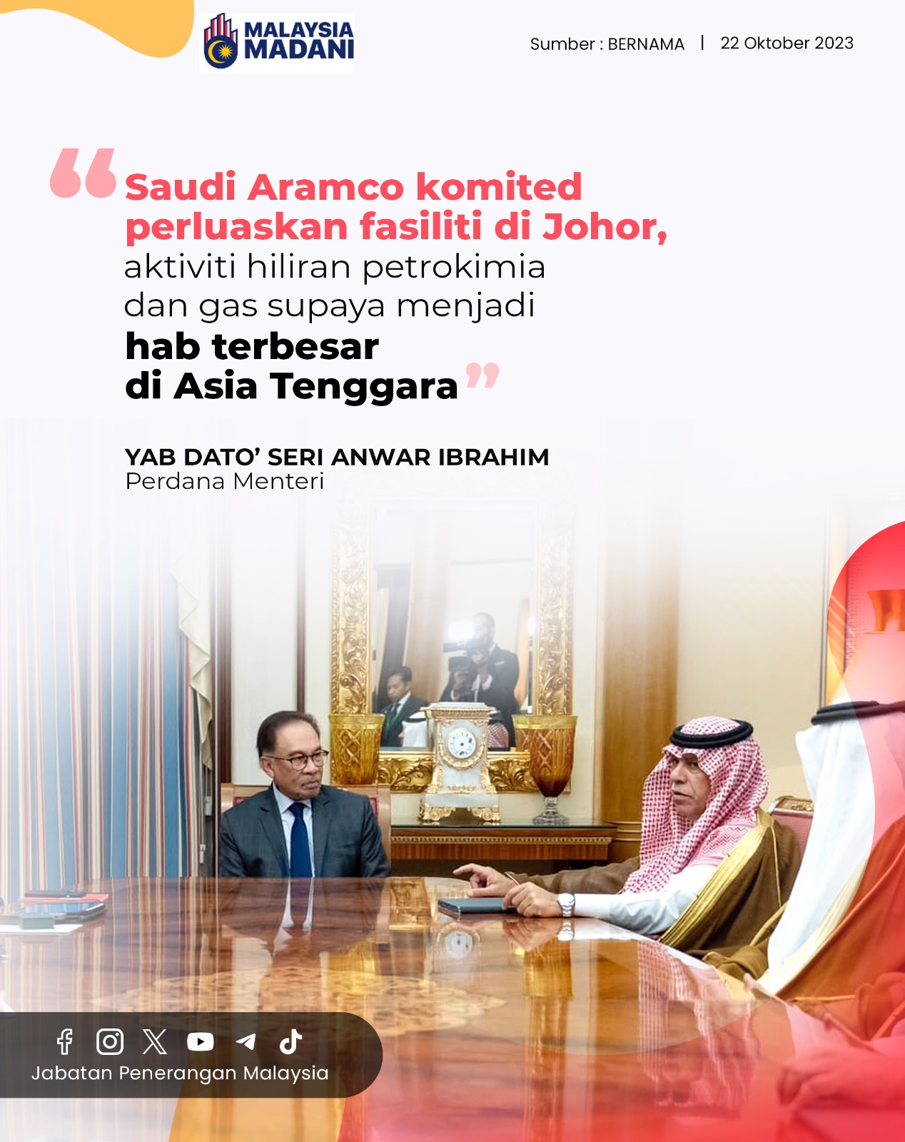 SAUDI ARAMCO KOMITED PERLUASKAN FASILITI DI JOHOR, AKTIVITI HILIRAN PETROKIMIA DAN GAS SUPAYA MENJADI HAB TERBESAR DI ASIA TENGGARA