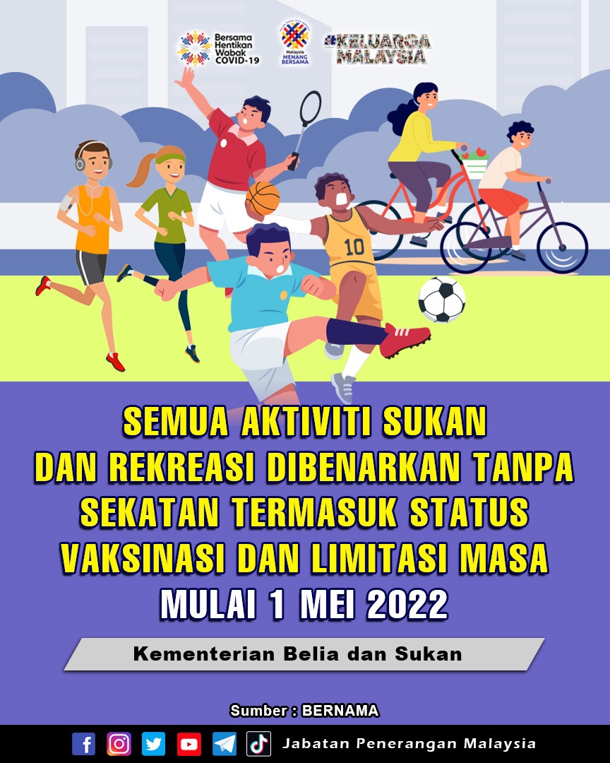 SEMUA AKTIVITI SUKAN DAN REKREASI DIBENARKAN TANPA SEKATAN TERMASUK STATUS VAKSINASI DAN LIMITASI MASA MULAI 1 MEI 2022