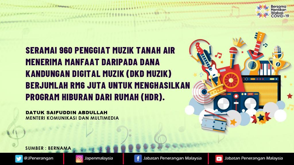 SERAMAI 960 PENGIAT SENI MUZIK TANAH AIR MENERIMA MANFAAT DARIPADA DANA KANDUNGAN DIGITAL MUZIK (DKD MUZIK) BERJUMLAH RM6 JUTA UNTUK MENGHASILKAN PROGRAM HIBURAN DARI RUMAH (HDR)